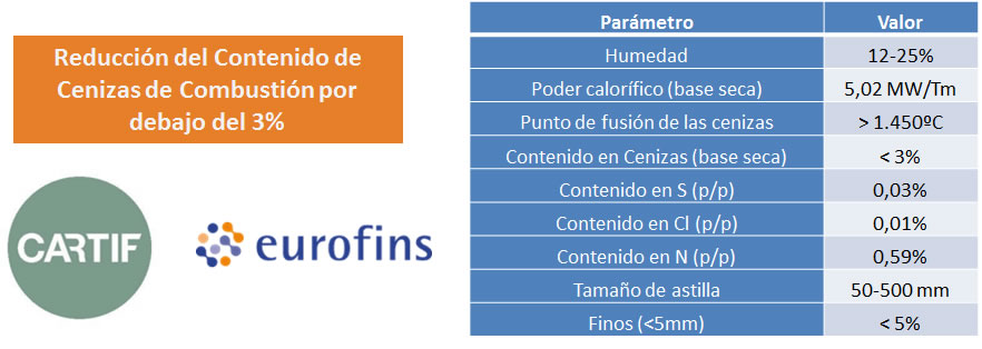 El Equipo desarrollado y patentado por ATHISA (ES2606774) permite reducir el contenido en cenizas por debajo del 3%, con una alta producción y reducido coste, para obtener una biomasa de alta calidad para ser utilizada en calderas industriales, redes de calor y plantas termoeléctricas.